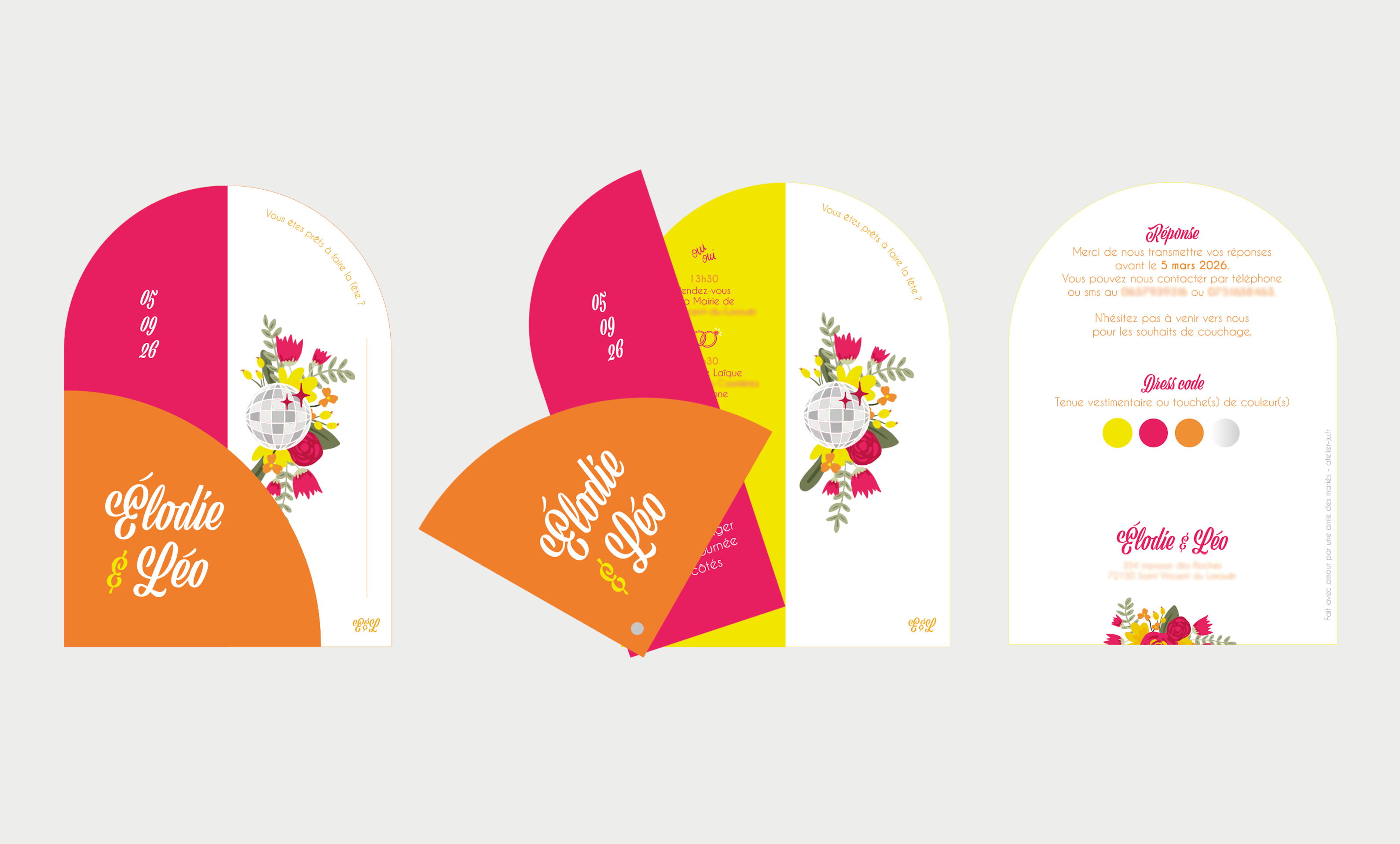 Élodie et Léo souhaitaient un faire part avec un format original, nous sommes alors parti une sorte d’enventail. Avec des couleurs vives, rose, orange et jaune et une boule à facettes.